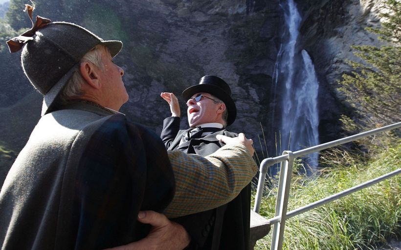 Mais Meiringen n’est pas en reste. Le centième anniversaire de la « mort » d’Holmes, en 1991, a été marqué d’une pierre blanche. Un musée a été aménagé cependant qu’une statue en bronze était érigée devant l’église anglaise. C’est en effet le 4 mai 1891 que Conan Doyle, lassé de son personnage –56 nouvelles et 4 romans—décide de le précipiter du haut de la septième cascade du Reichenbach, au terme d’un terrifiant combat avec son ennemi juré, le professeur James Moriarty. « Si je ne l’avais pas tué, c’est certainement lui qui aurait eu ma peau », note-t-il dans son journal. Mais c’est sans compter avec la déception des lecteurs du « Strand », « accros » aux enquêtes du détective et de son comparse le docteur Watson. Conan Doyle n’a d’autre issue que de le faire réapparaître dans « La Maison vide ». En fait, Sherlock a réussi à s’en tirer grâce à sa maîtrise d’un art martial japonais. Seule l’incarnation du mal que représente Moriarty a été propulsée dans les eaux tumultueuses.