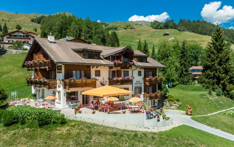 Das beliebteste Hundehotel der Schweiz ist im Kanton Graubünden beheimatet. Im als «Swiss Lodge» klassierten Hotel Gravas Restaurant Pizzeria in Vella empfangen die Gastgeber Beatrice und Fabio Di Blasi-Brand Gäste mit Hund zum rundum gelungenen Ferienerlebnis im wildromantischen Val Lumnezia.