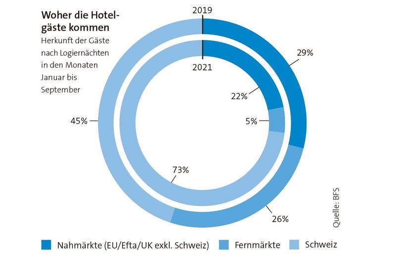 Es war eine der erfreulichen Überraschungen des zurückliegenden Jahres: die kräftige Erholung einiger Fernmärkte. So haben etwa Gäste aus den Golfstaaten im September 2021 häufiger in Schweizer Hotels übernachtet als im September 2019. Auch aus Nordamerika und Indien hat die Nachfrage nach Reisen in die Schweiz im Verlauf des Jahres spürbar angezogen. Und das, obwohl Anfang Jahr die besorgniserregende Delta-Variante begonnen hat, sich in Europa breitzumachen.