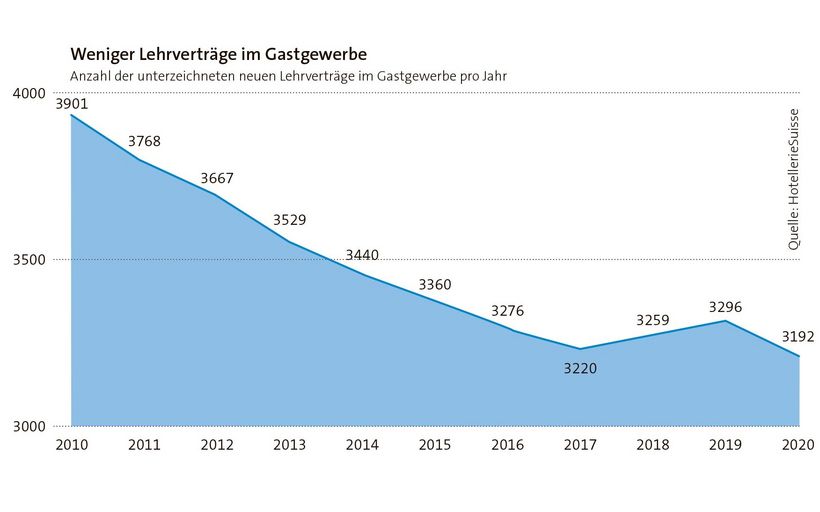Kommt hinzu, dass es auch bei der Ausbildung hapert: Gemäss Bildungsmarktdaten von HotellerieSuisse wurden im Gastgewerbe seit 2010 nie so wenige neue Lehrverträge unterzeichnet wie im Pandemiejahr 2020.