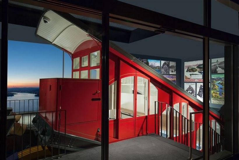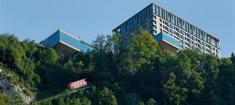 Mit jedem Meter Abstand vom Ufer nimmt die Entspannung zu. Nach der Ankunft am Fuss des Hotelbergs bringt die nach historischem Vorbild neu gebaute Bürgenstock-Bahn die Gäste in wenigen Minuten hoch ins Resort. Die neue Standseilbahn konnte rechtzeitig zur Eröffnung am Donnerstag den Betrieb fahrplanmässig aufnehmen. An der Bergstation führt ein Gang schnurstracks in die Hotellobby zur Rezeption.
