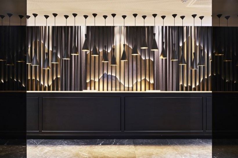 Das lokal inspirierte Design-Thema empfängt den Gast bereits beim Betreten des Hotels. Ebenfalls in Gold erstrahlt das Schweizer Alpenpanorama hinter der Rezeption. Die Silhouetten werden durch hochwertige Lodenvorhänge der Schweizer Firma Christian Fischbacher gerahmt. In verschiedenen Lounge-Ecken stehen edle Ledermöbel des italienischen Luxuslabels Baxter, Filzleuchten von Tom Dixon und goldene Fenster-Vorhänge. Und nicht fehlen darf der für Motel One ikonische Egg Chair in türkis.