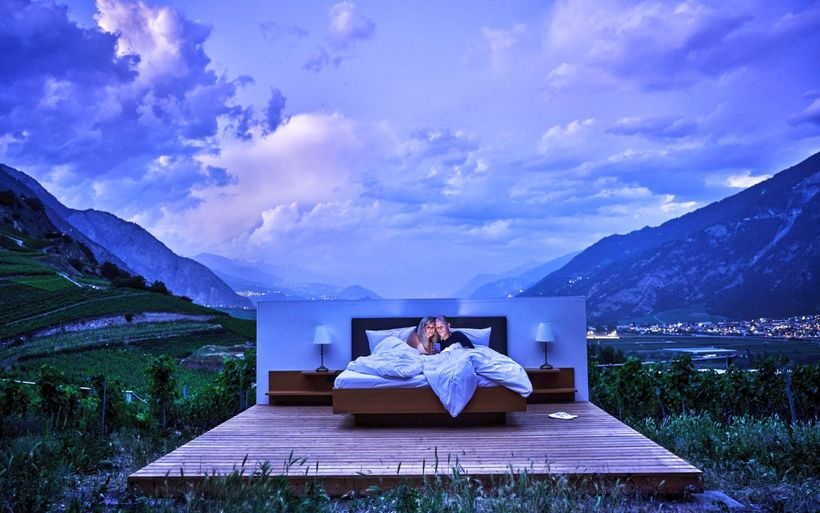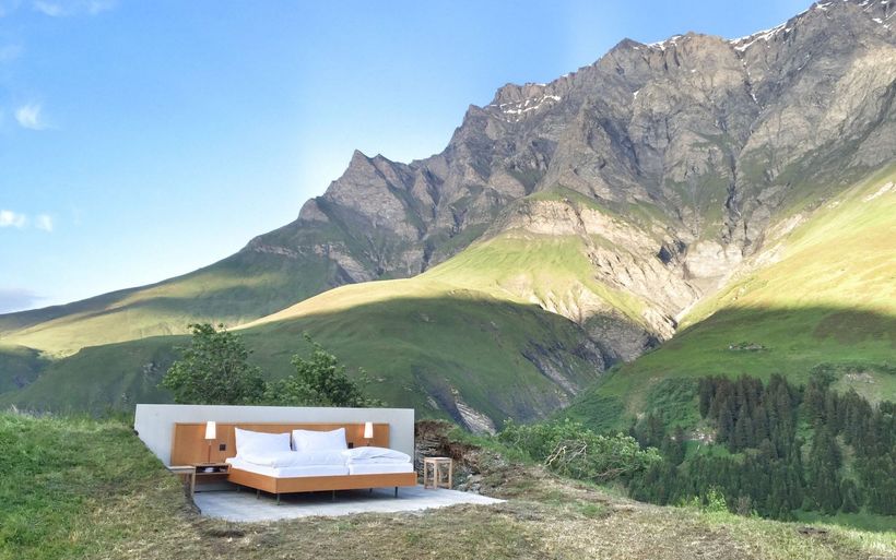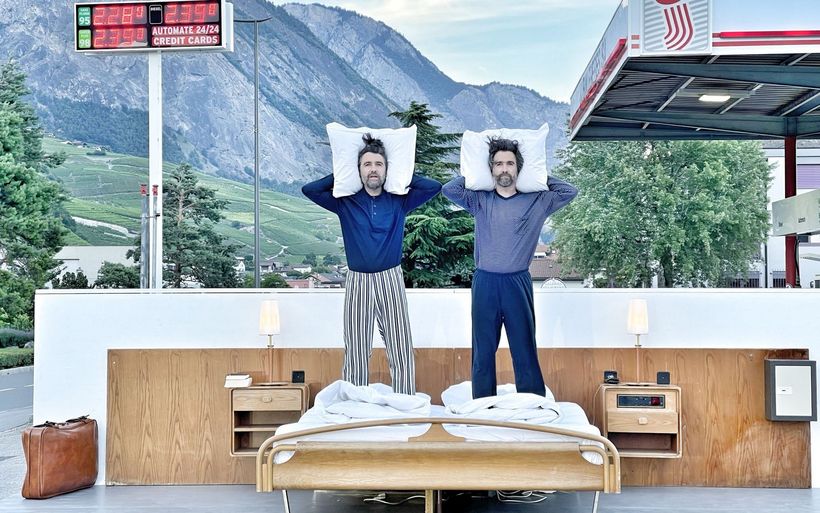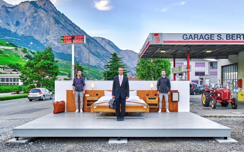 Ein Bett und zwei Nachttische zwischen einer Tankstelle und der Hauptstrasse: Die Brüder und Konzeptkünstler Frank und Patrik Riklin sowie der Hotelier Daniel Charbonnier lancieren in der Walliser Gemeinde Saillon eine anti-idyllische Version ihres «Null Stern Hotels».