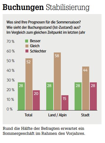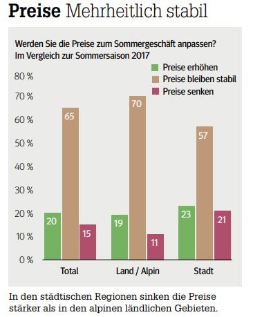 Für die anstehende Sommersaison erwartet rund die Hälfte der Umfrageteilnehmer eine gleich gute Saison wie im Vorjahr (Grafik oben). In den ländlich/alpinen Regionen sind es etwas mehr, in den Städten weniger. Gesamthaft haben 28 Prozent im Umfragezeitraum einen besseren Buchungsstand als im Vorjahr. Im Vergleich zur letztjährigen Sommersaison bleiben auch im kommenden Sommer 2017 die Preise mehrheitlich stabil (Grafik unten). Dies, da die Hoteliers für die Sommersaison keine weitere Verschlechterung der Geschäftslage erwarten. In den alpinen/ländlichen Gebieten senken deutlich weniger die Preise als in den städtischen Regionen. Dies liegt auch am zunehmenden Konkurrenzdruck in den Städten.