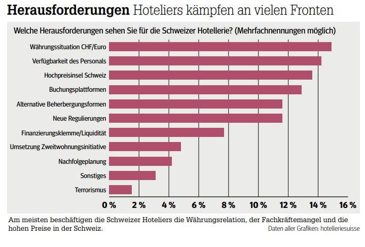 In der letzten Zeit hat sich der Schweizer Franken gegenüber dem Euro leicht abgeschwächt. Trotzdem wird die Währungssituation Franken-Euro von den Schweizer Hoteliers als grösste Herausforderung eingestuft (siehe Grafik Mitte). Dies geht aus der Umfrage hervor, welche hotelleriesuisse vom 8. bis 18. Mai 2018 bei den Verbandsmitgliedern durchgeführt hat. Weiterhin als grösste Herausforderungen werden Fachkräftemangel, die Hochpreisinsel Schweiz und Buchungsplattformen angesehen, wobei es regionale Unterschiede gibt. In den städtischen Gebieten werden Buchungsplattformen sowie alternative Beherbergungen auch als grosse Herausforderungen betrachtet. In den ländlich/alpinen Gebieten dominieren Währung, Hochpreisinsel Schweiz und der Fachkräftemangel. Die Nachfolgeplanung ist laut Umfrage vor allem ein ländlich/alpines Phänomen.