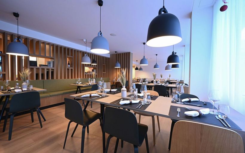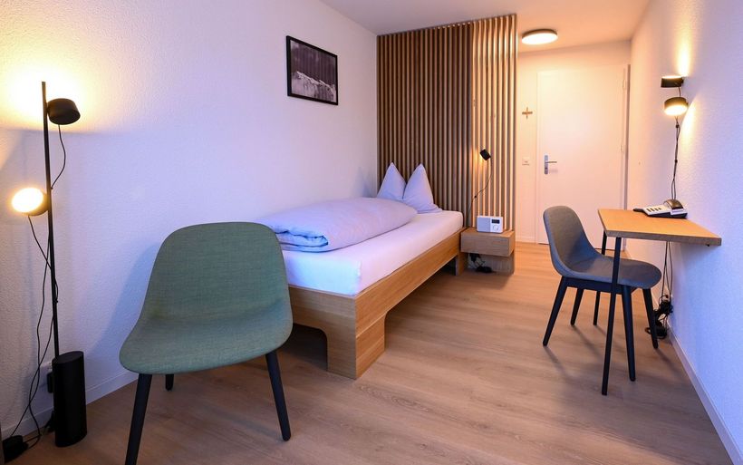 Eine moderne, in hellem Holz gehaltene Designsprache herrscht auch im Restaurationsteil im Erdgeschoss, mit seinen gut 80 Sitzplätzen. In den darüberliegenden Etagen die Einzelzimmer und Korridore komplett nach heutigen Gästebedürfnissen umgebauten. Jedes Zimmer ist mit Dusche und WC ausgestattet und verfügt über grosse Fensterfronten. Eine grandiose Aussicht bietet auch der Aufenthaltsraum mit Dachterrasse und 360-Grad-Rundblick.