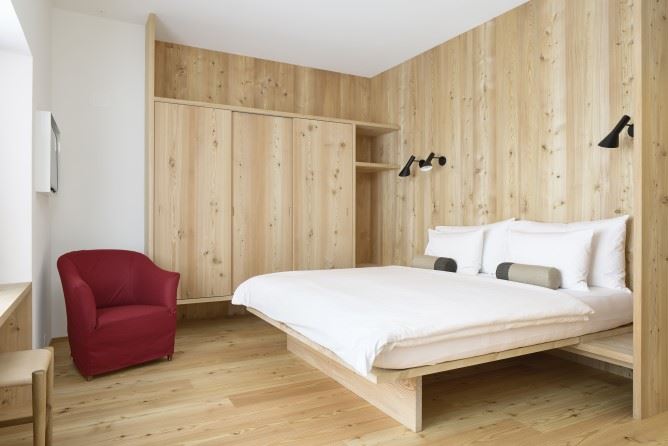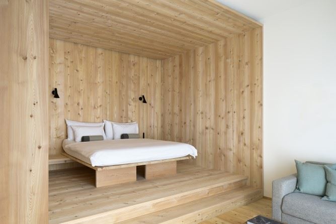 «Bei der Restaurierung setzten wir auf eine gradlinige und moderne Bauart, die sich am historischen Bestand und der Tradition des Gebäudes orientiert», erklärt Ruch. So seien die Zimmer von den einheimischen Hölzern Ahorn, Lärche und Arve geprägt, die Raumeinteilung und das speziell für das Hotel angefertigte Mobiliar seien schnörkellos und klar. Beim Holz handele es sich ausschliesslich um so genanntes «Mondholz», das unter Berücksichtigung des Mondkalenders im Engadin gefällt wurde und Authentizität, Nachhaltigkeit und Qualität vermitteln soll.