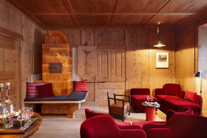 Der älteste Raum des Hauses – die «Stüvetta» – wurde möglichst originalgetreu belassen mit einer fast 300-jährigen Arvenholz-Täfelung und einem Tannenriemenboden. Neben Holzmöbeln von lokalen Schreinereien vermitteln Elemente aus Naturleder und exklusiv hergestellte Kissen viel Wohnlichkeit.