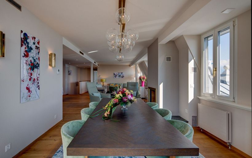 Dessinée par les architectes d’intérieur Kathrin Matthiesen et Mélanie Bach du bureau CM Design basé à Hambourg, le style créé pour la Penthouse Suite s’inspire d’une ancienne carte postale du bâtiment historique. Parmi les matériaux utilisés, le bois et les pierres naturelles occupent une place importante, notamment pour la salle de bain, la cuisine et la cheminée. Les tons blancs, crèmes et gris créent une harmonie avec le parquet de bois. Des nuances de verts qui rappellent le Léman sont sublimées par des motifs floraux apportant une touche de fraîcheur qui se retrouve également sur la terrasse fleurie. Les travaux de rénovation ont été exécutés par le bureau Felix Graf GmbH, basé à Zenting en Allemagne.