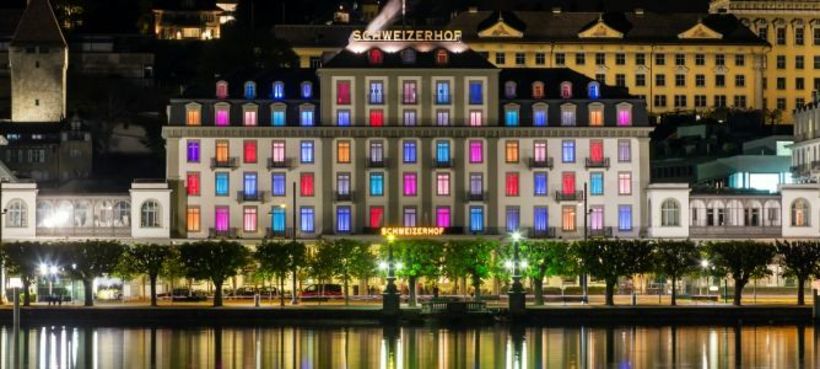 Mit der erfolgreichen Eröffnung der 101 Zimmer wurde auch die neue, farbenfrohe und jederzeit anpassbare Innenbeleuchtung des «Schweizerhofs» eingeweiht, die ab sofort in den Luzerner Nachthimmel leuchtet. (htr/npa/av)