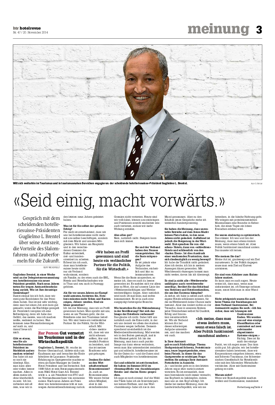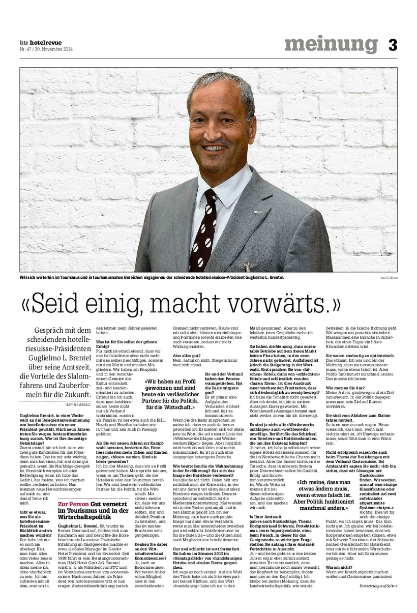 Im Interview mit Gery Nievergelt, Chefredaktor der htr hotel revue, spricht der scheidenden hotelleriesuisse-Präsidenten über seine Amtszeit, die Vorteile des Slalomfahrens und Zauberformeln für die Zukunft.