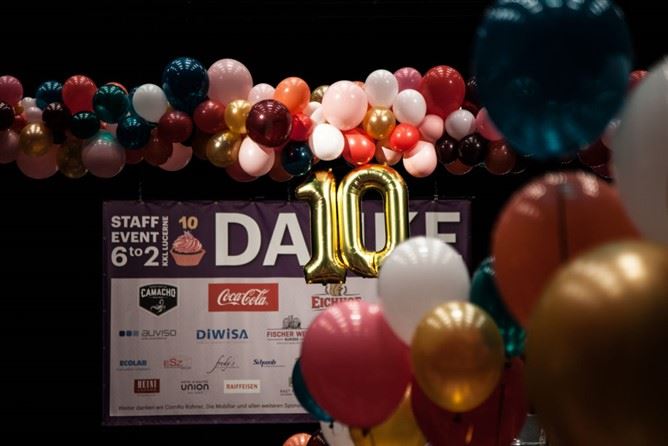 An den verschiedenen Bars und Verpflegungsständen bedienten für einmal von die Chefs, die Hotel-Direktoren, als Barkeeper. Von den zahlreichen kulinarischen Köstlichkeiten zogen der Foodtruck und die grosse Geburtstagstorte am meisten Aufmerksamkeit auf sich. Ein Highlight bot auch die kleinste Disco Europas auf dem Vorplatz des KKL. Im Gebäude selbst legte DJ Maik Wisler von Radio Pilatus den passenden Sound bis in die frühen Morgenstunden auf.
