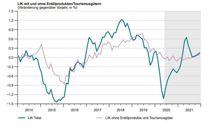 Für diese Indizes wurde die gemessene Preisentwicklung der erfassbaren Produkte auch für die fehlenden Produkte der gleichen Kategorie imputiert. Die erfassten Preise für diese touristischen Güter sind teils stark zurückgegangen. Werden diese Güter aus dem Index herausgerechnet, fällt die Inflation im Mai etwa einen halben Prozentpunkt höher aus. Wird zusätzlich der Effekt der Erdölprodukte eliminiert, verändern sich die Preise im Vergleich zum Vorjahr nicht.