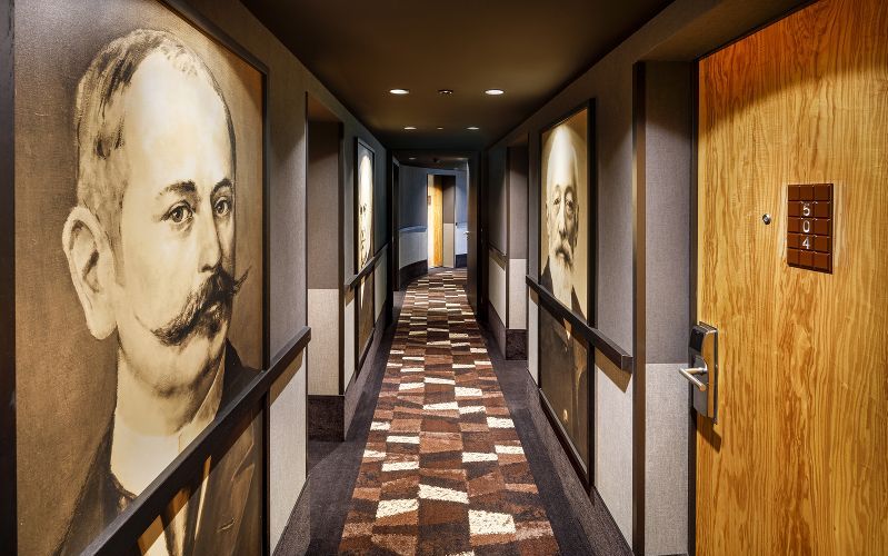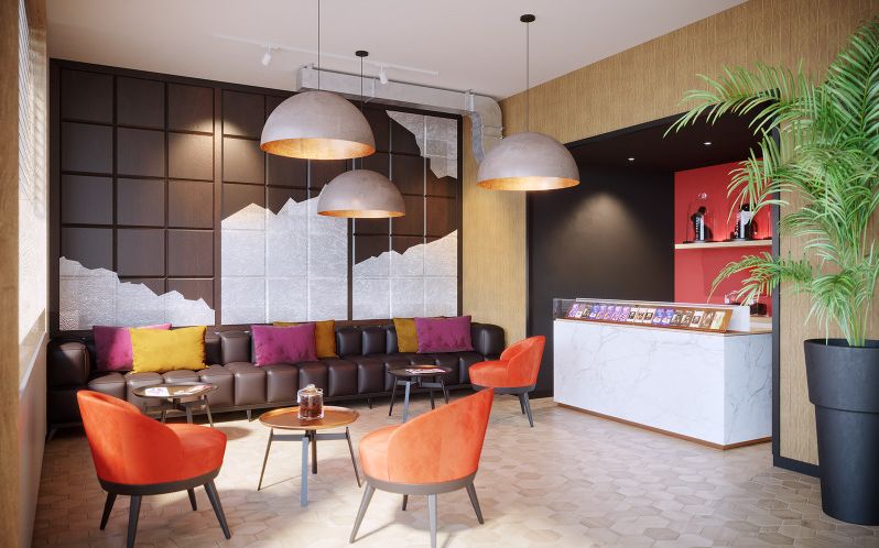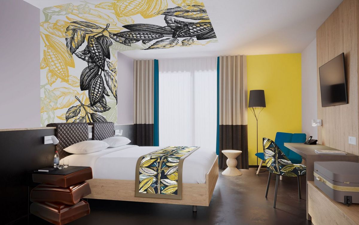 Le nouvel hôtel ne sent pas à proprement parler le cacao, mais en a la couleur. La priorité est donnée aux tons chauds et marron. Dans les chambres, la fève de cacao se déploie avec une fresque au plafond. Petit clin d'œil amusant: la table de nuit en bois laqué prend des allures de carrés de chocolat empilés. Dans la salle de bain, le carrelage noir et blanc évoque des tablettes bicolores. Dans les couloirs, on retrouve les portraits de chocolatiers célèbres. L'odeur de chocolat se matérialise à la réception, avec un kiosque à chocolats, valorisant les créations d'artisans locaux, et une petite fontaine de chocolat. «J'accepte la critique du kitsch, mais j'estime que l'on peut être un peu caricatural dans un hôtel, sachant qu'on y passe une ou deux nuits. Mon but n'est toutefois pas de réaliser un musée, mais juste de raconter une histoire avant de s'endormir, comme on le fait pour les enfants.» Pour la rénovation et l'agrandissement de ses deux enseignes, Eric Fassbind s'est entouré de son épouse architecte Pascale Fassbind et du studio parisien Marc Hertrich & Nicolas Adnet qui signe l'agencement intérieur.