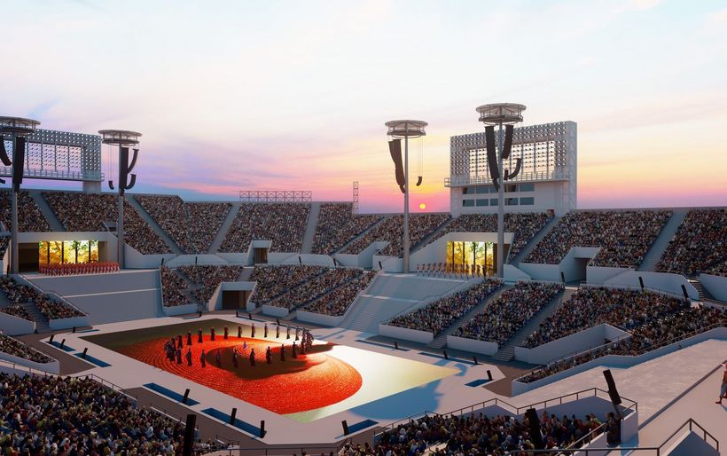 Lärm vom Bohren, Hämmern und Sägen durchdringt die Baustelle. Der Bau der Struktur der Arena ist zwar abgeschlossen, aber noch sind die Bühnentechniker damit beschäftigt, das Stadion mit Ton und Licht auszustatten. Zwischen 50 und 60 Personen arbeiten gegenwärtig auf der Baustelle.