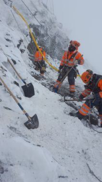 Diese Arbeiten während des Winters auszuführen bringt den Vorteil, dass durch die kalten, frostigen Temperaturen keine Gefahr von Steinschlag besteht, da der Fels in sich kompakt und zugefroren ist. Für die Arbeiter hingegen stellen diese meteorologischen Bedingungen eine Härteprobe dar. Sie kämpfen mit Temperaturen bis -30 Grad und Windgeschwindigkeiten von über 60 km/h. Wahrlich kein Job für Schwache!