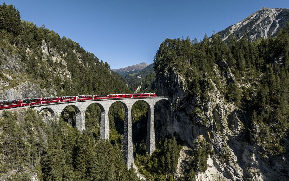 (Keystone-SDA) Die Strecke des Bernina Express ist die höchstgelegene ganzjährig betriebene Bahnverbindung über die Alpen, wie die Rhätische Bahn (RhB) anlässlich des 50-jährigen Jubiläums mitteilte. Von Chur geht es über historische Viadukte vorbei an den Gletschern des Engadins bis ins Bündner Südtal Puschlav und weiter ins norditalienische Tirano.