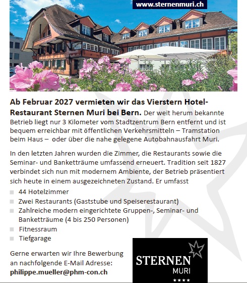 Ab Februar 2027 vermieten wir das Vierstern Hotel- Restaurant Sternen Muri bei Bern