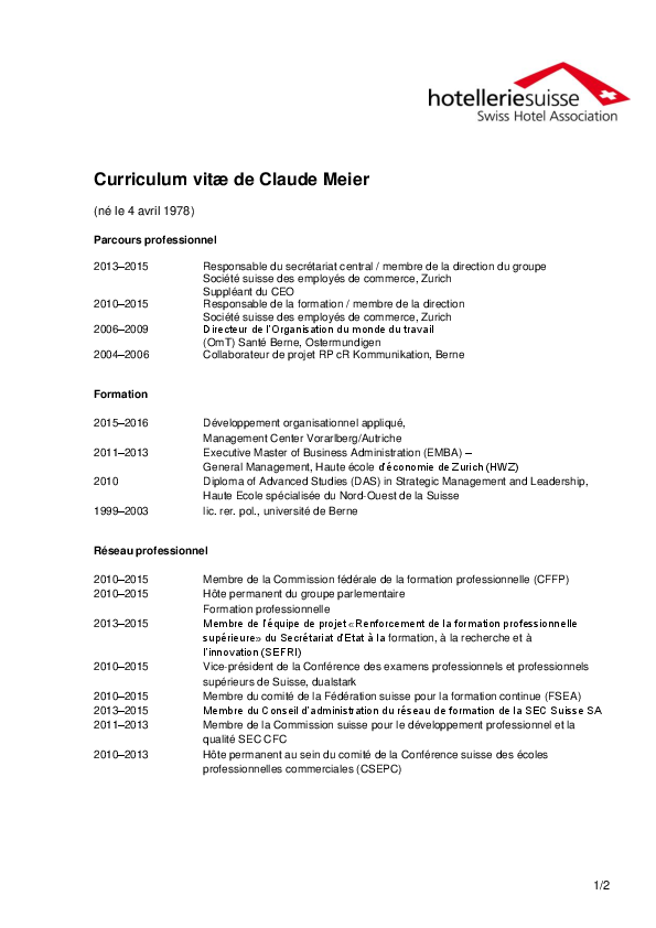Claude Meier, lic. rer. pol, EMBA, justifie de plusieurs années d’expérience de conduite aux niveaux opérationnel et stratégique au sein de plusieurs associations et organisations nationales et cantonales. Il a notamment été actif comme directeur de l’Organisation du monde du travail (OmT) de la Santé, à Berne, ainsi que, dernièrement, comme responsable du secrétariat central et de la formation de la Société suisse des employés de commerce. Claude Meier prendra ses fonctions le 1er juillet 2016.