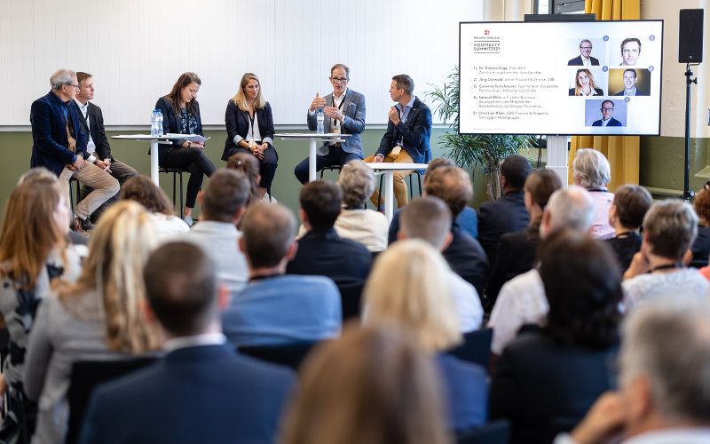 Hochkarätige Podiumsteilnehmende am Finanzforum von HotellerieSuisse und der der Schweizerischen Gesellschaft für Hotelkredit SGH (v.l.): Urs Gredig, Moderation, Theresia Sokoll, Direktorin und Gastgeberin, Hotel Kettenbrücke AG, Daniel Schneider, Gründer, Monoplan AG, Michael Thomann, Inhaber und Geschäftsführer, Thomann Hospitality Management, Prof. Dr. Thomas Bieger, Universität St. Gallen, Präsident SGH. Hochkarätige Podiumsteilnehmende am Finanzforum von HotellerieSuisse und der der Schweizerischen Gesellschaft für Hotelkredit SGH (v.l.): Urs Gredig, Moderation, Theresia Sokoll, Direktorin und Gastgeberin, Hotel Kettenbrücke AG, Daniel Schneider, Gründer, Monoplan AG, Michael Thomann, Inhaber und Geschäftsführer, Thomann Hospitality Management, Prof. Dr. Thomas Bieger, Universität St. Gallen, Präsident SGH. Bild: Corinne Glanzmann/Nadia Schärli/Philipp Schmidli