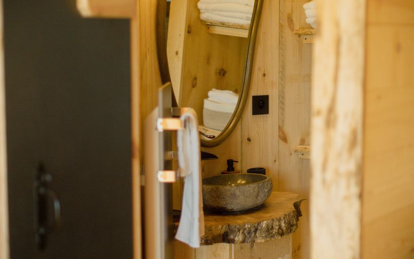 L'odeur du feu de bois embaume ce cocon à l'intérieur ouateux et au parquet de chêne. «Le thermostat est bloqué à 21-22 degrés, le client ne peut pas chauffer au-delà. Une manière aussi de sensibiliser aux principes de durabilité.» Le chauffage fait partie des engagements du groupe en matière de développement durable. «Avec les pellets, nous utilisons l'équivalent de 50 stères de bois, soit quatre fois moins qu'avec des bûches.» La consommation d'eau a également été réduite grâce à des pommeaux de douche performants. «Ce système nous permet d'économiser 1 m³ d'eau par jour», indique Emilien Sommier. Une poubelle de tri est à disposition des hôtes, tout comme des savons artisanaux, du shampoing solide, sans oublier l'eau de source. Ce qui ressemble à une climatisation n'en est pas une: «Nous puisons l'air frais qui se trouve sous la plateforme du pod et le réinjectons dans le pod. En été, il fait au maximum 21 degrés à l'intérieur. On n'atteindra jamais les 15 degrés comme avec une climatisation traditionnelle», explique Emilien Sommier. Adhérant au programme Swisstainable, le groupe Definitely Different est aussi candidat au Swiss Triple Impact. «Leurs exigences nous font travailler. Nous visons aussi le label B Corp en 2024. Les Whitepods font office de laboratoire, avant d'appliquer ces principes aux autres entités du groupe.» Plusieurs projets sont en cours, comme la création d'une ligne de cosmétique et de nettoyage fabriquée à 100% à partir des cendres de bois.