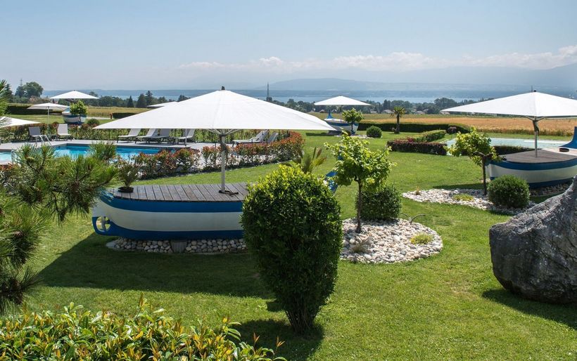 Le jardin avec vue sur le Léman et les Alpes. Bild: Everness Hotel & Resort