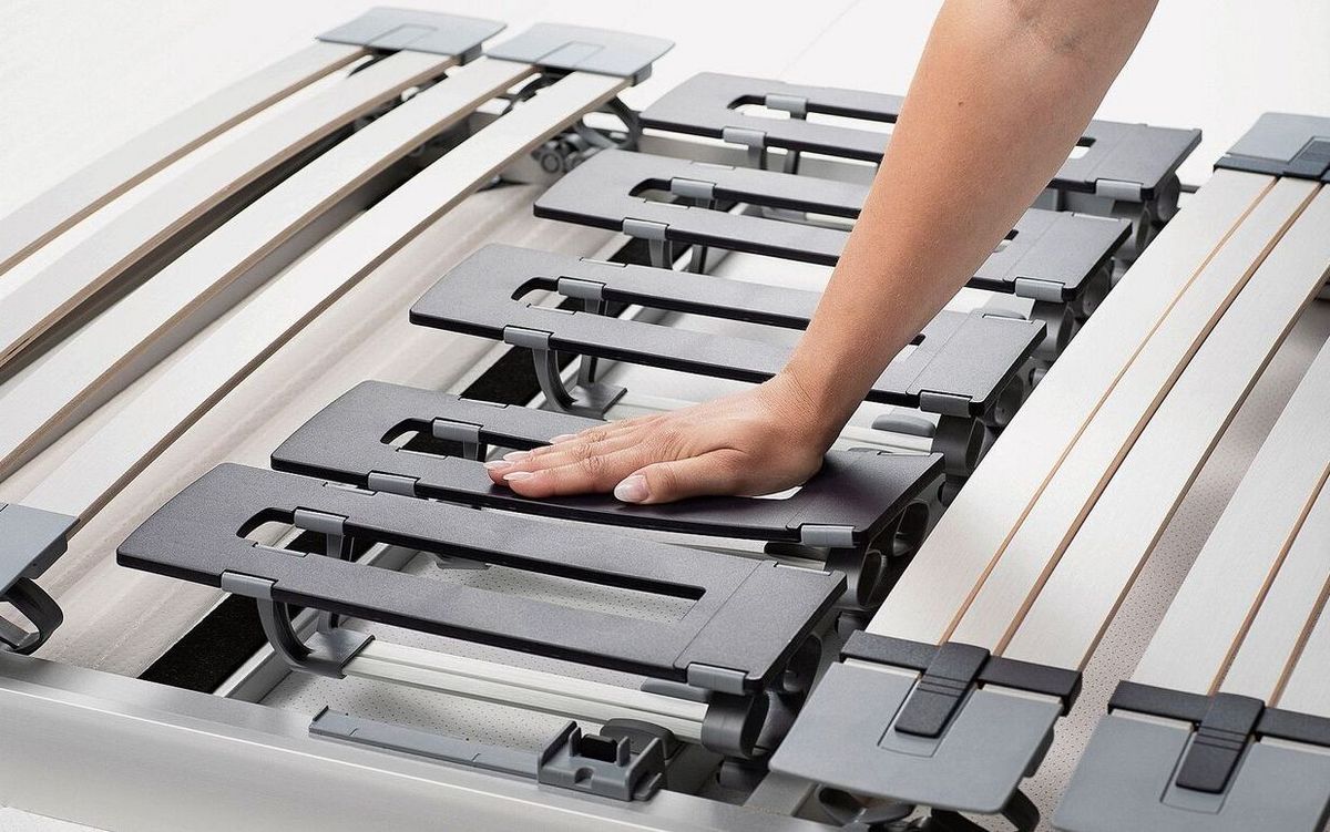 Bekannt ist, dass der Lattenrost für eine gute Durchlüftung des Bettes sorgt und ein gutes Schlafklima unterstützt. Weniger hingegen, dass dieser die ergonomische Lagerung des Körpers beeinflusst. Je dünner die Matratze, desto grösser ist der Einfluss des Lattenrosts auf den Liegekomfort. In jedem Fall bildet der Rost aber die Basis der Körperlagerung und kann durch seine elastische Liegefläche Bewegungen des Körpers besser ausgleichen als jede Matratze. Meist bildet der Rost eine der Matratze ähnliche Zonierung ab, die sich auch oft verstellen lässt. So können kritische Körperteile wie Schultern und Nacken zusätzlich entlastet werden. Verspannungen, Durchblutungsstörungen und Schmerzen lassen sich so verhindern oder minimieren. Der aber vielleicht grösste Vorteil ist die Anpassbarkeit des Härtegrads. Mittels Schiebeelementen lässt sich bei vielen Modellen die Kompaktheit der Liegefläche variieren. So kann das Bettsystem der Präferenz oder körperlichen Konstitution des Gasts angepasst werden.