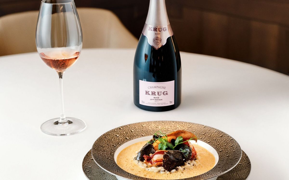 Le riz est l'ingrédient sélectionné cette année par Krug pour son programme proposé aux ambassadeurs du monde entier. Philippe Chevrier a proposé une création avec le Rosé 25ème édition, conçu autour du millésime 2013, un assemblage avec une dominante de Pinot Noir, du Chardonnay et du Pinot Meunier. Un vin pensé pour jouer le rôle du vin rouge dans un repas avec ses arômes de groseille, de fruits séchés et sa dimension épicée. Le chef de Châteauvieux semble plutôt vouloir retrouver son versant électrique en proposant un homard bleu de Bretagne nacré à cœur, snacké à la plancha, un risotto carnaroli cuit pendant 14 minutes et recouvert d’une couche généreuse de truffe noire du Vaucluse. Ici le croquant du plat rentre en contraste avec l’onctuosité du jus de carapace affiné avec le Rosé. En salle, le jeune maître d’hôtel Axel Meffre sait répondre à toutes les questions sur les cuissons en détails et ne manque jamais un sourire complice qui réconforte.