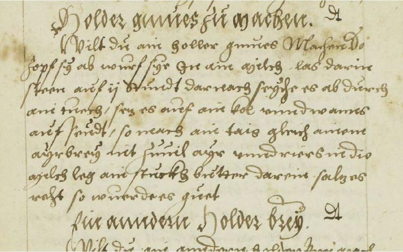 Willst du ein Holundermus machen, so zupfe die Beeren ab, wirf sie in Milch, lass sie darin zwei Stunden stehen, dann siebe sie durch ein Tuch, setze sie auf die Glut und wenn es aufsiedet, so mache einen Teig wie einen Eierbrei, aber nicht zu viele Eier, und rühre ihn in die Milch; lege ein Stück Butter hinein, salze es gut, so wird es gut.