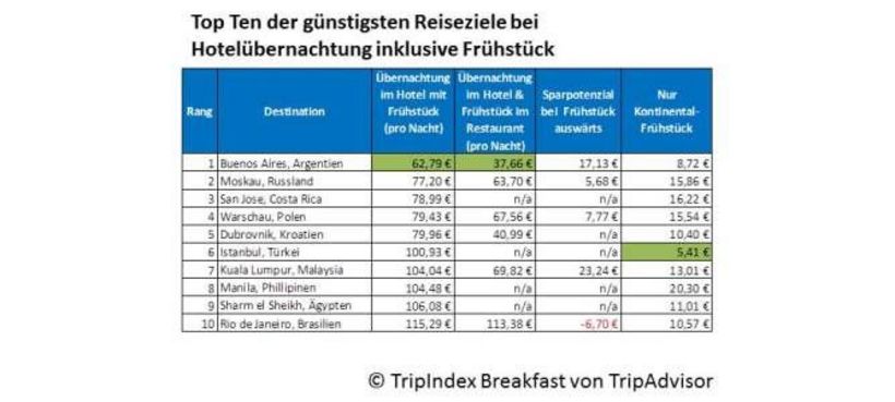 Betrachtet man die Kosten für Hotel inklusive Frühstück, zeigt der «Tripindex Breakfast», dass weltweit Buenos Aires und San José sowie in Europa Warschau und Dubrovnik die günstigsten Kandidaten sind – mit einem insgesamten Preis von durchschnittlich unter 100 Euro pro Nacht. Berlin und Wien liegen dabei erneut in der Mitte, mit einem durchschnittlichen Preis von 150,30 Euro beziehungsweise 143,60 Euro. Am teuersten schlägt das gleiche Angebot in Paris, Tokio und New York zu buche, wo Reisende mit 348,80 bis 464,21 Euro für Hotel mit inbegriffener Morgenmahlzeit rechnen müssen.