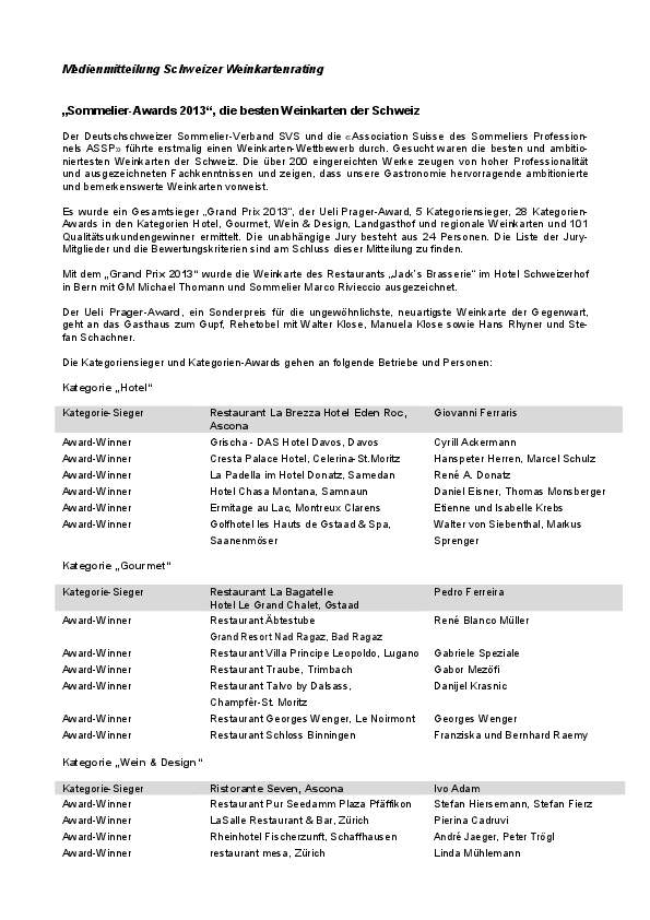 Die Weinkarte mit einem perfekten, umfassenden, vielseitigen und fachkundigen Angebot wird als Gesamtsieger mit dem «Sommelier-Award» als «Weinkarte des Jahres 2013» gewürdigt. Den Sommelier-Award «Grand Prix 2013» gewinnt das Restaurant «Jack’s Brasserie», Hotel Schweizerhof in Bern, mit GM Michael Thomann und Sommelier Marco Rivieccio.