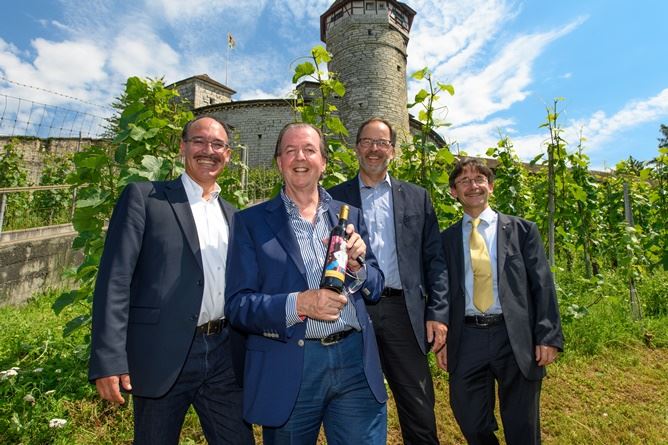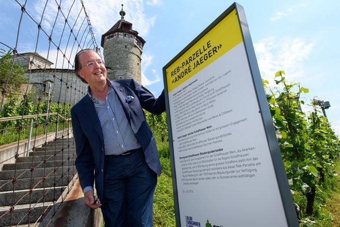 «Das ist eine unglaubliche Wertschätzung der Stadt Schaffhausen», freut sich Spitzen-Gastronom André Jaeger über seine Reb-Parzelle am Munot-Rebberg. Zeitlebens stellt ihm das Schaffhauser Blauburgunderland den Ertrag dieser Reb-Parzelle zur Verfügung. Daraus ergeben sich pro Jahr 100 Flaschen Blauburgunder. Diese werden jedes Jahr zu Gunsten einer gemeinnützigen, weihnachtlichen «Tischlein-deck-dich»-Aktion versteigert.