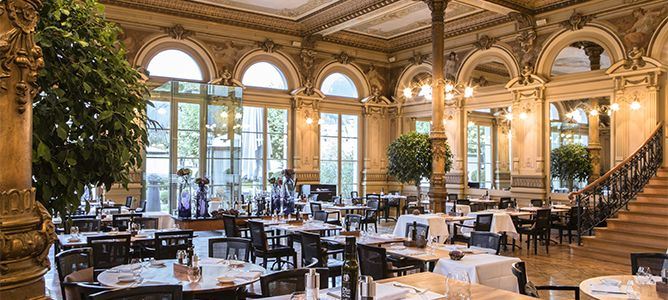 Wer von der Lobby her kommend das Luxushotel durchquert und dann oben an der Treppe steht mit freiem Blick auf den Saal – dem stockt kurz der Atem. Man kann es nicht anders sagen: Der gut sechs Meter hohe Saal in bester Belle-Epoque-Manier ist ein Traum. Imposante Säulen und Fensterbögen, hohe Spiegelwände, kunstvolle Stuckaturen, dezent ausgeleuchtete Deckenmalereien – und mittendrin schlicht gehaltene Tische, eine lange Bar als Treffpunkt und in der Ecke ein Pizza-Ofen, wie es sich gehört für ein klassisches italienisches Restaurant. Mit einem entscheidenden Unterschied: dass es nicht in irgendeinem Haus ist, sondern im altehrwürdigen Victoria-Jungfrau Grand Hotel & Spa in Interlaken BE.