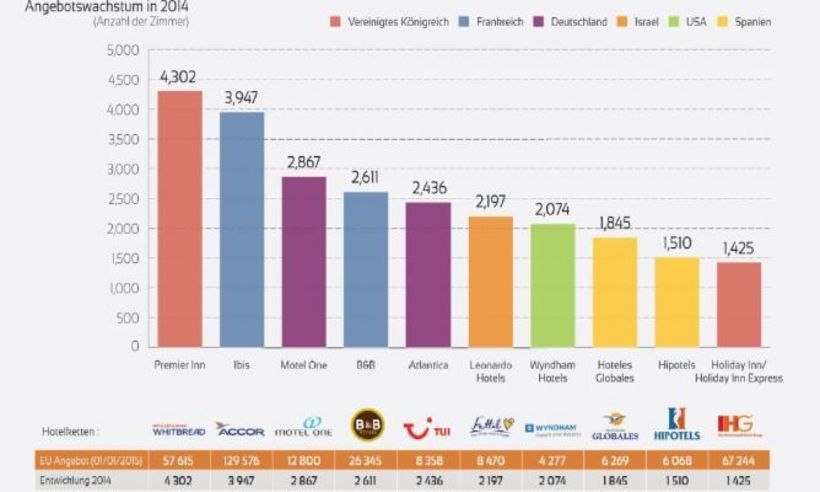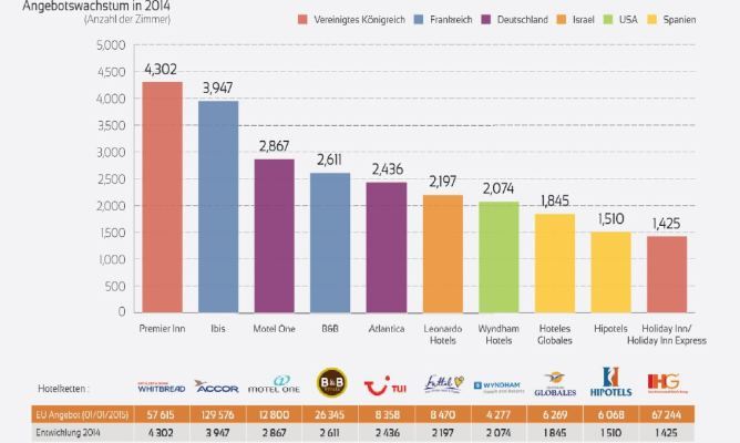Die britische Marke Premier Inn verstärkte sein Angebot im vergangenenJahr um mehr als 4'300 Zimmer. Aufgrund ihrer Angebotsentwicklung innerhalb des Vereinigten Königreichs überholtedie Marke «Ibis» hinsichtlich der Anzahl an zusätzlichen Zimmern (abgezogen der Zimmer, welche nicht mehrder jeweiligen Marke angehören). Trotzdem ist die französische Marke Ibis zum 1. Januar 2015 Marktführer in Bezug auf das Angebot mit fast130'000 Zimmern innerhalb der 28 EU-Ländern.