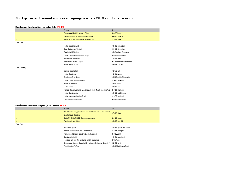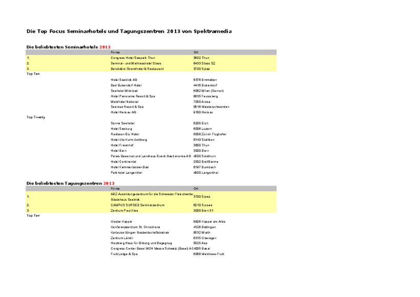 Seit 1996 organisiert der im Human Resource Management spezialisierte Fachverlag Spektramedia die jährliche Wahl der Focus Top Seminarhotels und Tagungszentren. Dabei entscheiden Trainer, Ausbilderinnen, Seminarorganisatoren und Personalverantwortliche, welche von den über 1000 Seminarhotels und Tagungszentren ihre beliebtesten sind. In der Wahl können sie 100 Punkte auf drei bis fünf Häuser in Kategorien wie Service, Ambiente, und zeitgemässe Infrastruktur verteilen.