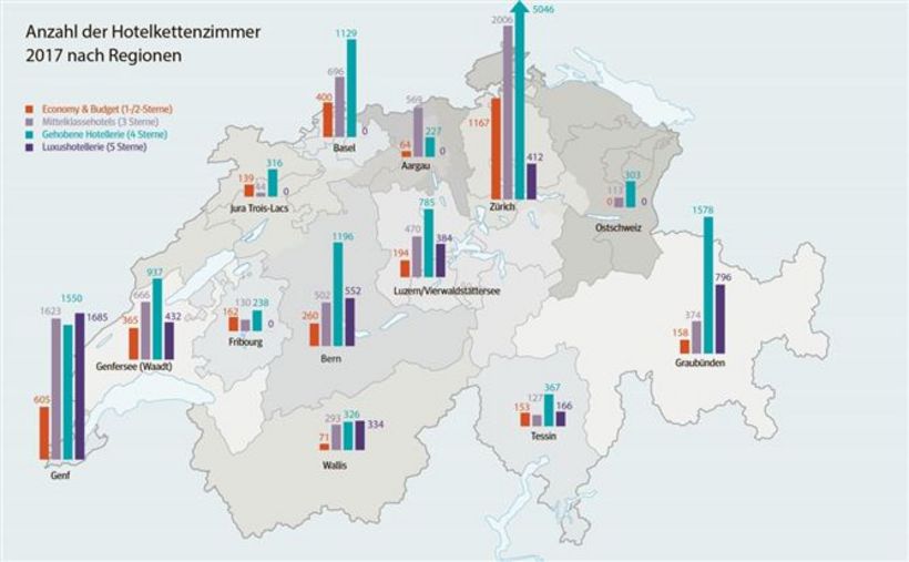 Während die Kettenhotellerie im 2017 in der Schweiz expandierte, schrumpfte der Gesamtmarkt der Schweizer Hotels um 1 Prozent. Weniger gravierend sah es bei der Anzahl Zimmer aus. Hier konnte auch der Gesamtmarkt immerhin noch um 3 Prozent zulegen. Im Gesamtmarkt besteht also weiterhin eine Tendenz zu grösseren Einheiten.
