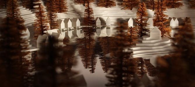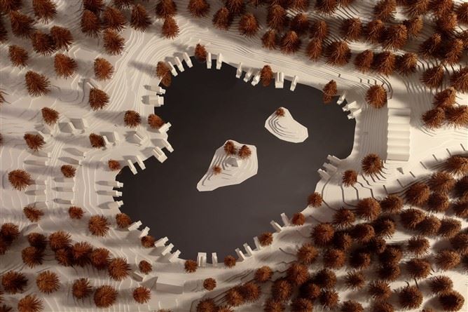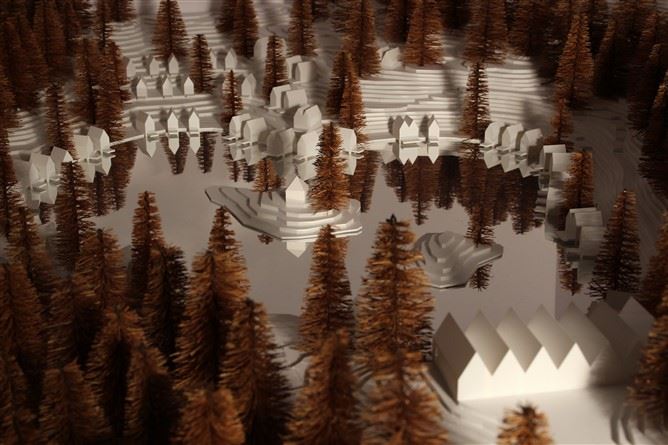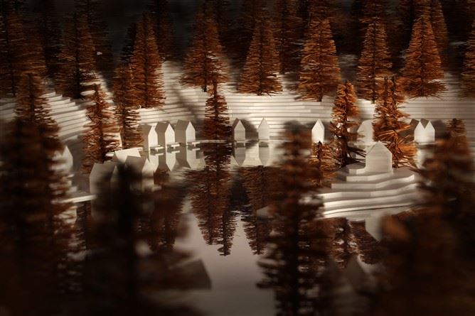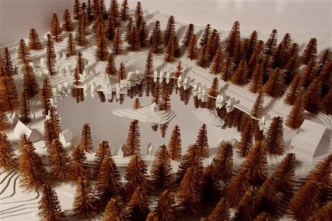 Bis 2020 soll rund um den See eine Pfahlbau-Siedlung aus kleinen Wohnhütten entstehen, die in Holzbauweise errichtet werden. Sie sind eine Mischung aus Fischerhaus und Baumhaus, denn sie stehen auf Pfosten im Ufer des Sees, und besitzen Dachfenster, durch die man in die Wipfel der darüber aufragenden Tannen sieht.