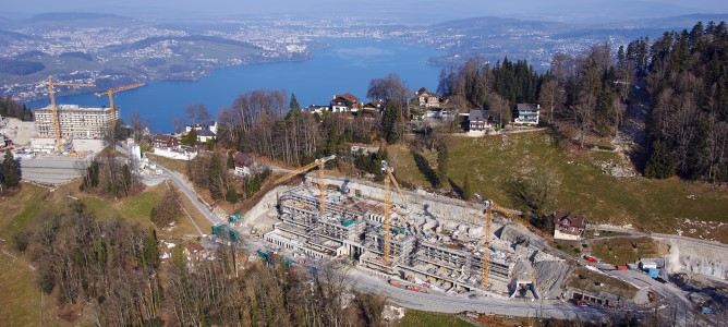 Die aufwändigen Aushubarbeiten beim Bürgenstock Hotel sind fertig, nun kann dasFundament erstellt werden. Der Um- und Neubau des 10'000 Quadratmeter grossenBürgenstock Alpine Spa ist ebenfalls auf Kurs. Bezugsbereit sind zehn PanoramaResidence-Suiten.