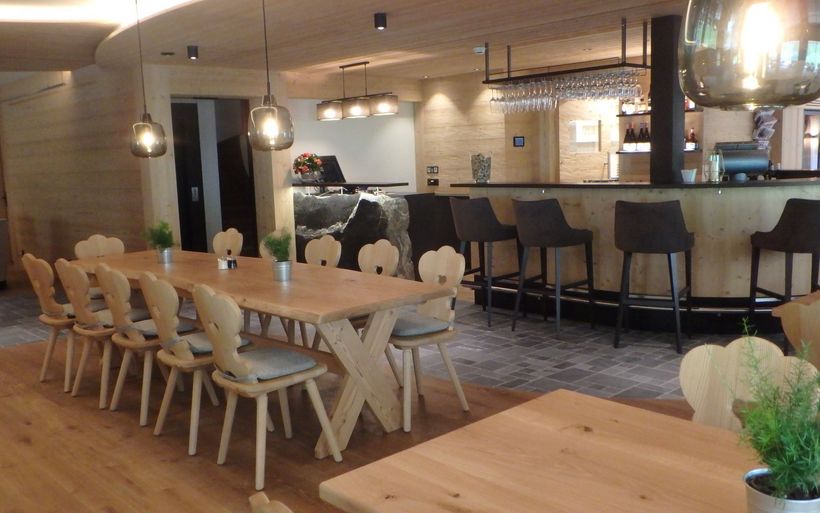 Das Herzstück des Parterrebereichs bleibt die bewährte Bar, während das grosszügig konzipierte Restaurant und die Kamin-Lounge zum Geniessen einladen. Knorriges Holz und natürlicher Stein schaffen im komplett umgestalteten Gastronomieteil eine heimelige Atmosphäre und harmonieren mit dem Chalet-Stil des Hauses. Auf der Speisekarte findet der Gast Gerichte mit Zutaten von lokalen Lieferanten und Bauern, frisch interpretiert mit einem internationalen Hauch.