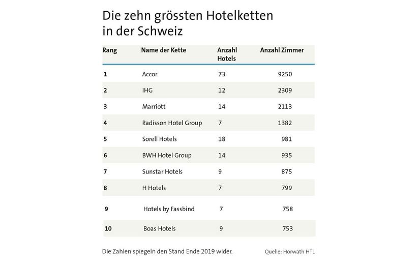 Die mit Abstand grösste Hotelkette ist immer noch Accor mit 73 Hotels und total 9350 Zimmern. Fast jedes vierte Kettenhotel (23 %) in der Schweiz wird damit von Accor betrieben und 27 Prozent des gesamten Zimmerangebots von Hotelketten entfallen auf die Gruppe. Die ebenfalls international operierende Hotelkette IHG rangiert auf dem zweiten Platz. IHG hält dabei aber nur ein Viertel der Anzahl der von Accor geführten Hotelzimmer. Marriott bekleidet – bezogen auf die Zimmerzahl – den dritten Platz.