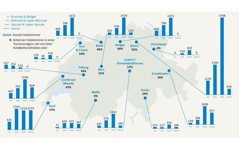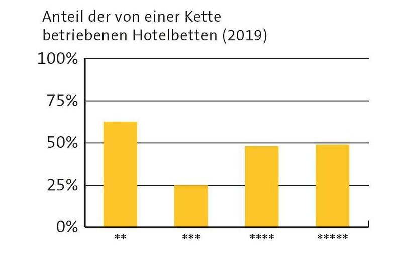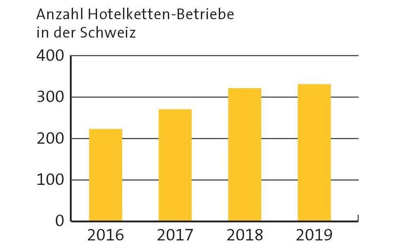 Allen Unkenrufen zum Trotz hat sich das Hotelkettenwachstum 2019 im Vergleich zu den Vorjahren jedoch markant verlangsamt und lag bei nur noch knapp 2 Prozent. Zwischen 2016 und 2018 lag der Anstieg noch bei fast 50 Prozent. Das stärkste Wachstum verzeichnet nach wie vor Zürich, aber auch Bern hat zugelegt: In den nächsten Jahren sollen 7 neue Hotels mit 857 Zimmern dazukommen.