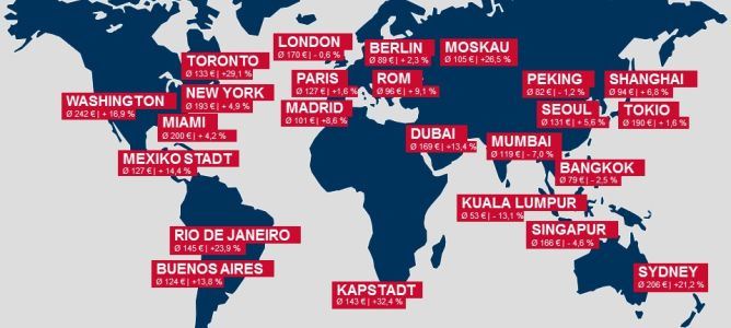 Global betrachtet zeigt sich eine große Spannweite bei den Preisen für eine Nacht im Hotel mit unterschiedlichen Entwicklungen zum Vorjahreszeitraum. Dies liegt gemäss HRS zum Teil in unterschiedlichen Buchungsvolumina begründet. So konnte HRS in seiner Datenbank für Kapstadt eine Preisentwicklung von 32,4 Prozent auf 143 Euro feststellen. Die Preise in Kuala Lumpur fielen dagegen um 13,1 Prozent auf durchschnittlich 53 Euro. (htr/pt)