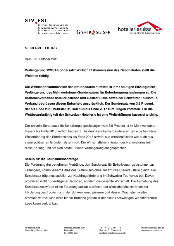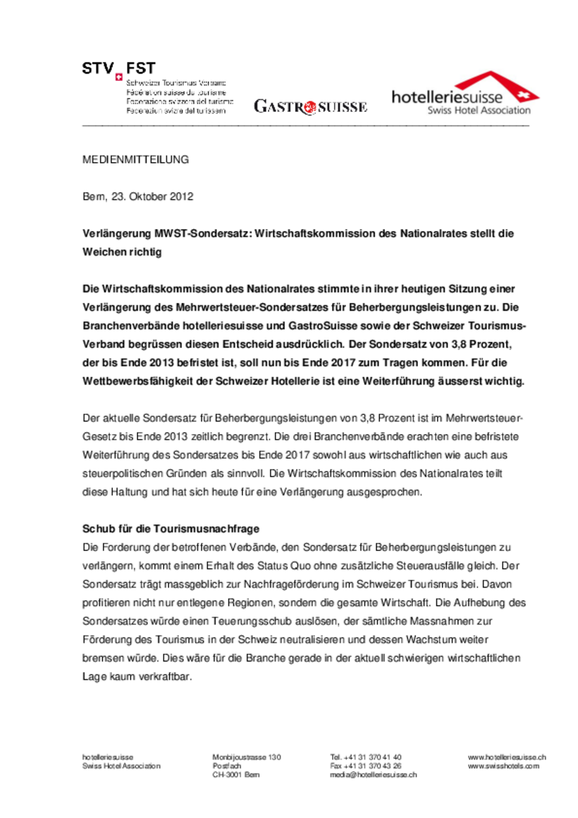 Der Entscheid der nationalrätlichen Wirtschaftskommission wurde bei den Branchenverbänden hotelleriesuisse und GastroSuisse sowie dem Schweizer Tourismus-Verband (STV) ausdrücklich begrüsst, wie aus einer gemeinsamen Medienmitteilung hervorgeht. Die Verbände sehen in der Weiterführung des Sondersatzes von 3,8 Prozent einen Schub für die Tourismusnachfrage und eine Stärkung der internationalen Wettbewerbsfähigkeit für die Schweizer Hotellerie.