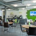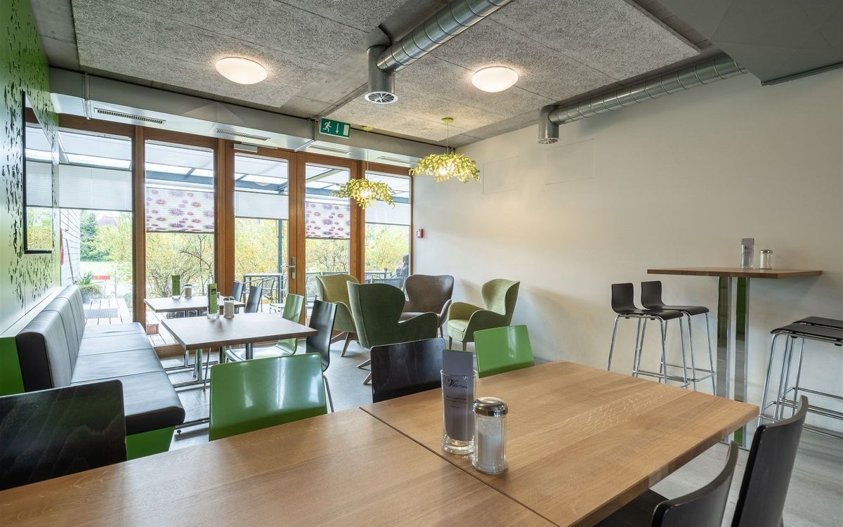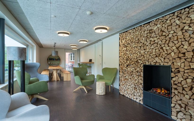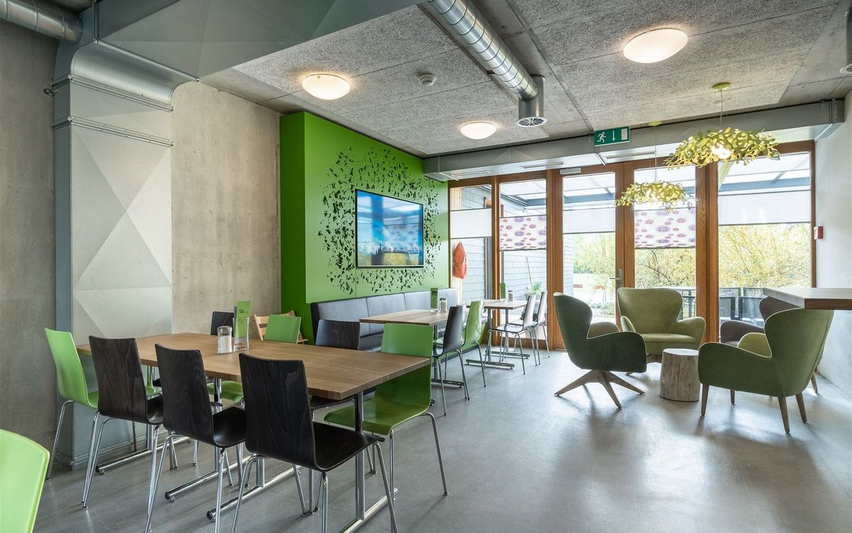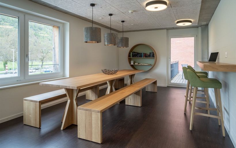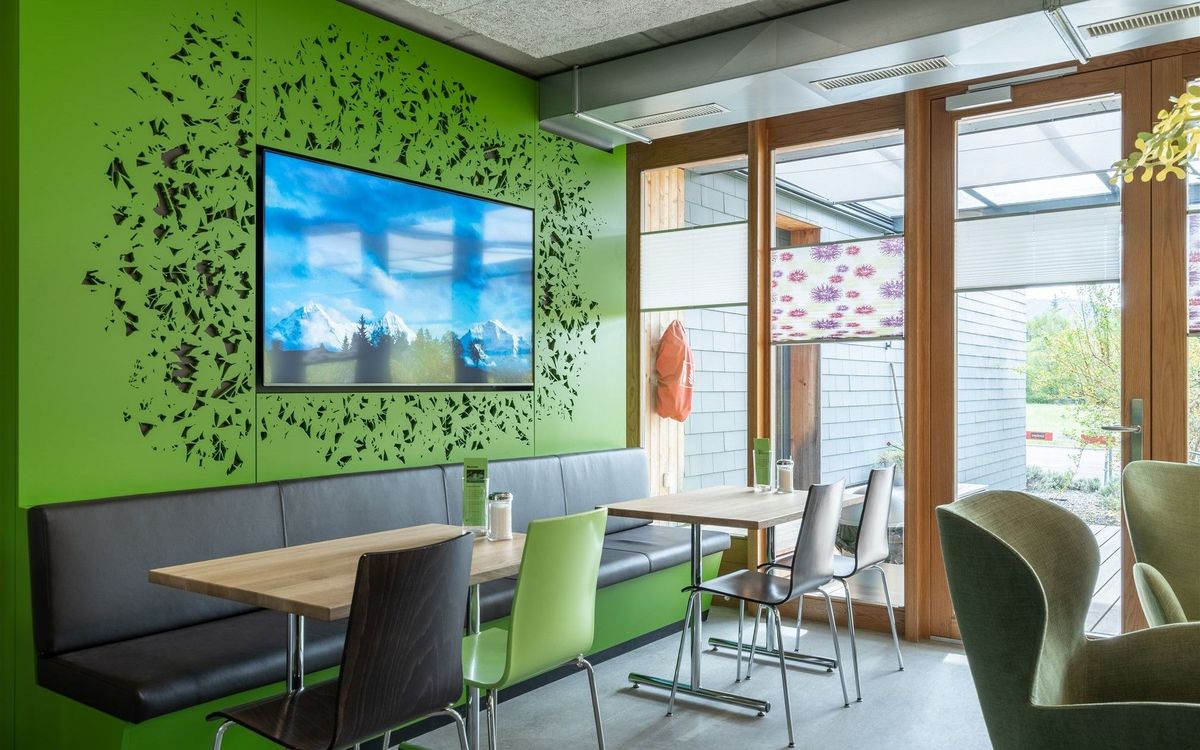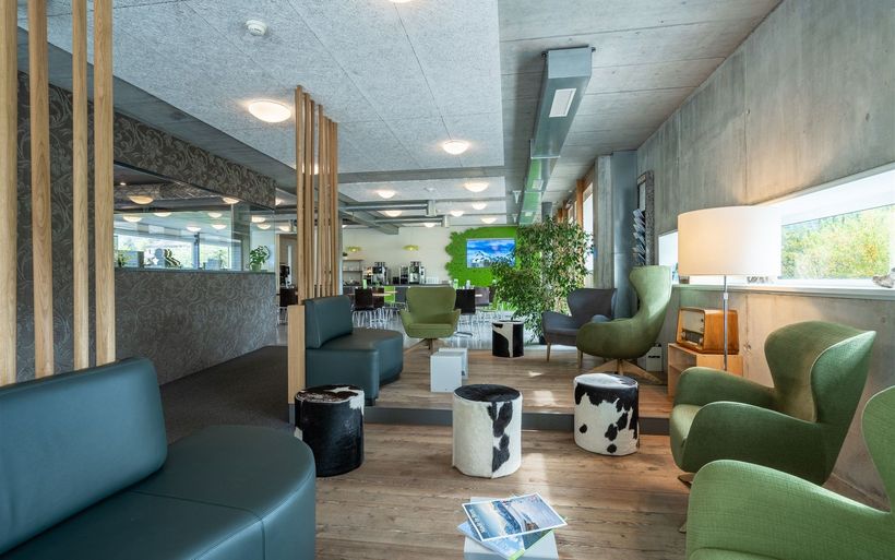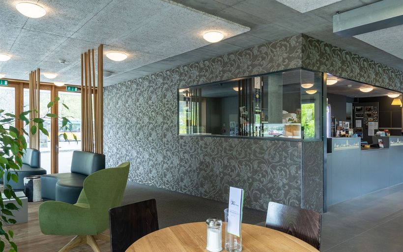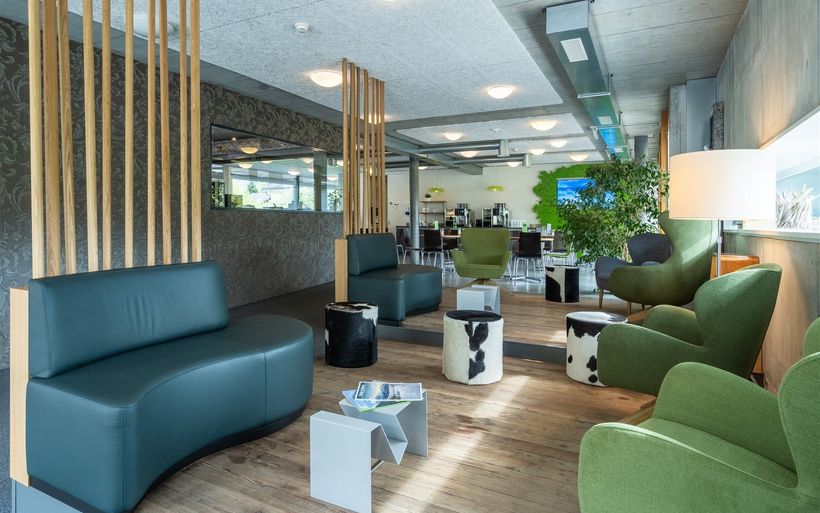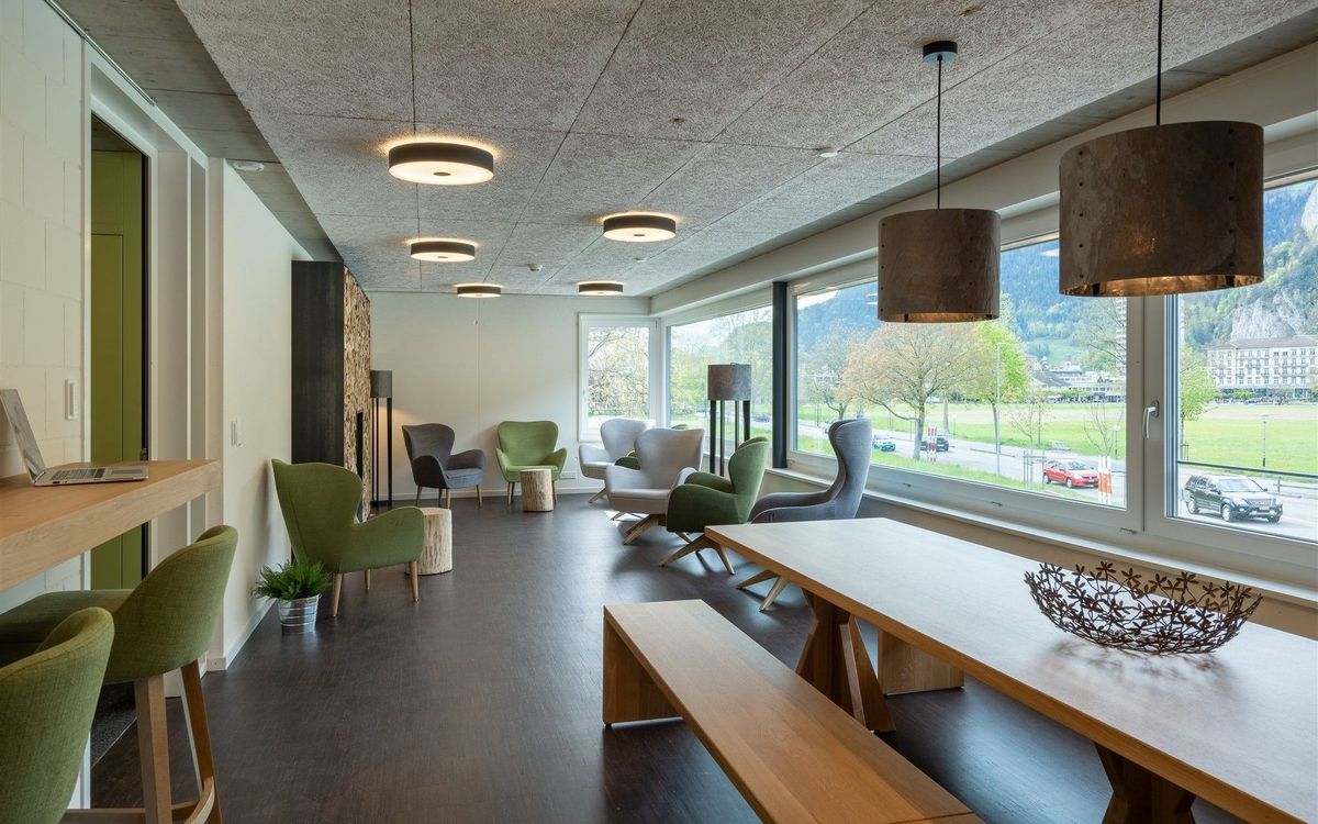 Ruheoasen, Gesprächsecken, Esstische und eine TV-Lounge stehen den Gästen im Erdgeschoss zur Verfügung. Im Obergeschoss warten ein grosser Holztisch, diverse Arbeits- und Ruhezonen sowie eine gemütliche Kamin-Installation mit dazugehörender Holzbeige auf die Gäste. Die satten Grün- und erdigen Brauntöne wirken entspannend und zugleich erfrischend und die renovierten Räumlichkeiten laden so zum konzentrierten Arbeiten und entspannten Verweilen ein.