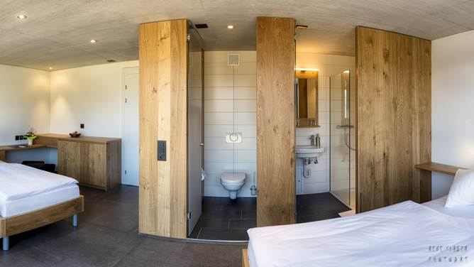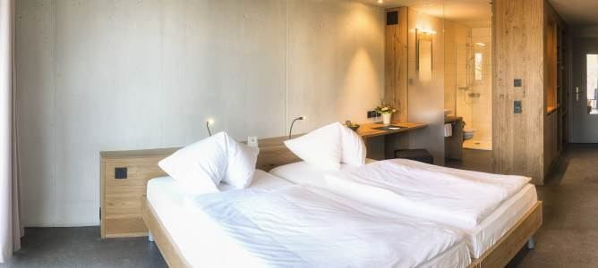 Das Angebot des Business-Hotels umfasst 14 Einzelzimmer, 44 Doppelzimmer, 12 Attika-Doppelzimmer und vier 4-Bettzimmer. Alle Zimmer verfügen über einen grossen Balkon mit unbebauter Aussicht. Eine kontrollierteRaumlüftung, Fussbodenheizung, Betten im Boxspring-Style, High-Speed-WLAN, Ethernet, Telefonie und SAT-TV sowie Computer Zusatzfunktionen bieten den Gästen viel Komfort und zeitgemässe Elektronik.