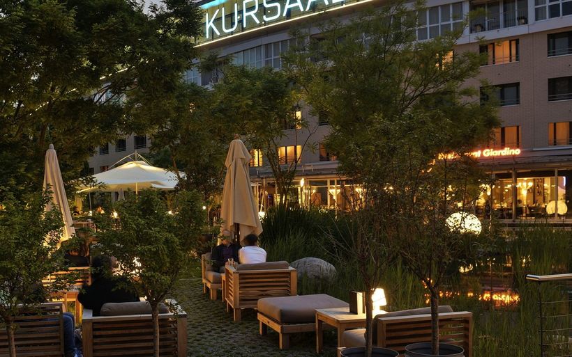 Zu Cocktails nach einem aktiven Tag in der Stadt oder nach geschäftlichen Meetings laden die Garten-Lounge des Hotels mit ihrem malerischen Fischteich und die Kursaal Bar ein. Im Sommer empfängt die Dachterrasse Gäste mit Panorama-Aussichten auf die Stadt und die Alpen.