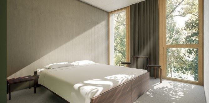 Die grösste Änderung ist ein Teilabbruch mit Neubau: Das angebaute ehemalige Jugendhaus wird rückgebaut und durch ein freistehendes, an den schlanken Haupttrakt angepasstes Gebäude ersetzt. Die bestehenden 26 Zimmer des denkmalgeschützten Gebäudes mit ihren insgesamt 94 Betten werden auf Basis der bestehenden Struktur neu organisiert und den neuen Standards angepasst.