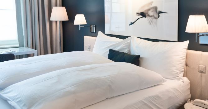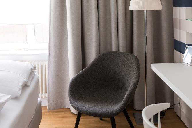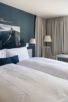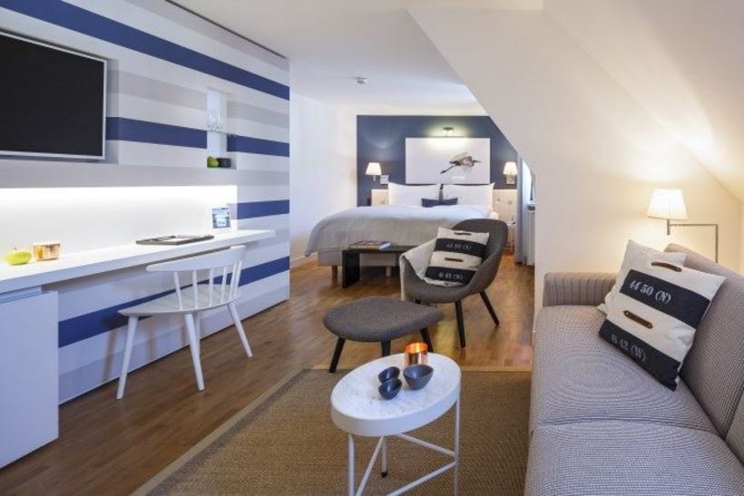 Grosse Boxspring-Betten, griffige Polstersessel, warme Holzböden, modern eingerichtete Arbeitsplätze, Vorhänge aus segeltuchfarbigem Stoff, elegant gestaltete Badezimmer und Garderoben in Schiffskofferoptik sollen dem Gast das Gefühl von einem Tag am See verleihen.