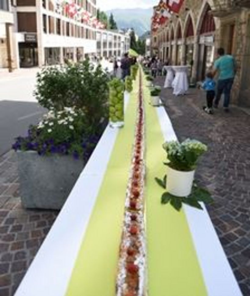 Mit 120 Metern Apfelstrudel, die direkt vor den Pforten des Hotels aufgebaut wurden, läutet das Badrutt's Palace Hotel am Sonntag die Festwoche ein. Das Team rund um Stefan Gerber, Chef Pâtissier im Traditionshotel, baute die überdimensionale Gaumenfreude am Sonntagmittag vom früheren ‹Café Palace› bis hinunter zum Luxusgeschäft ‹Loro Piana› auf, sodass alle Besucher den Apfelstrudel bis zum späten Nachmittag geniessen konnten