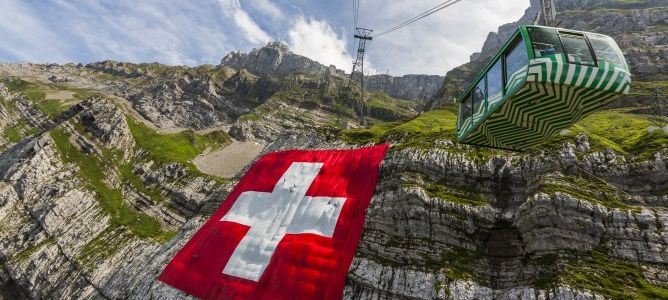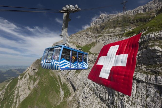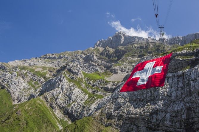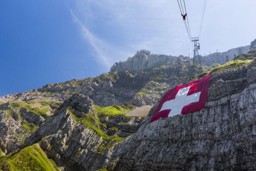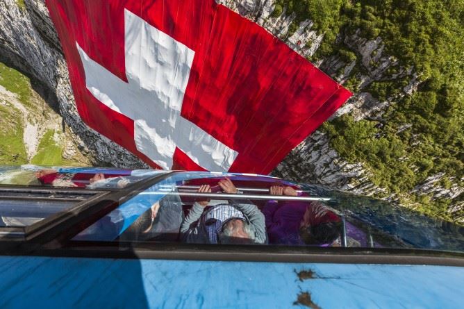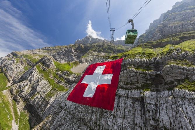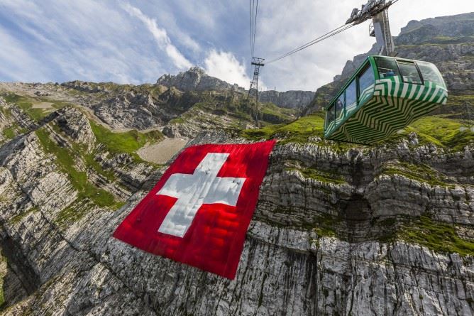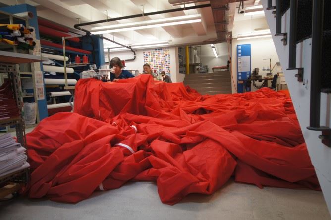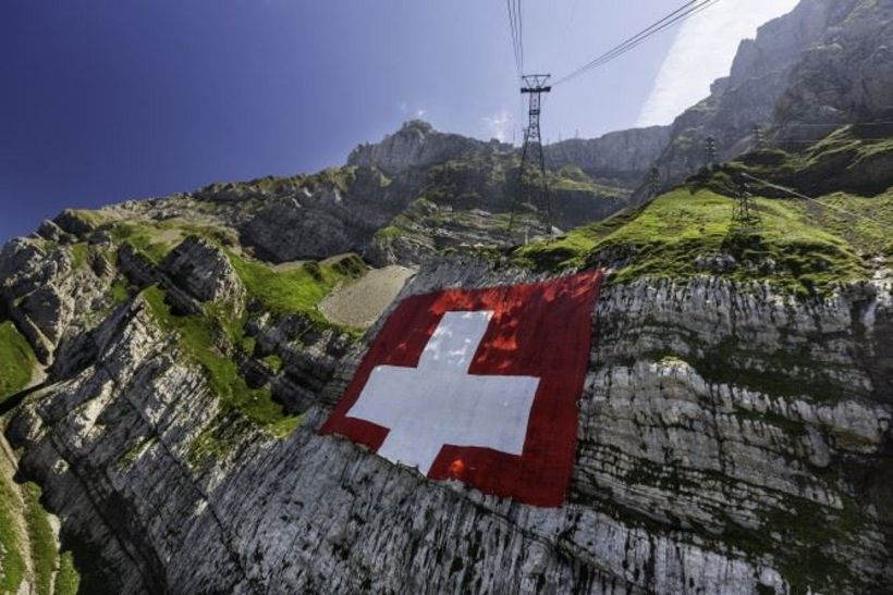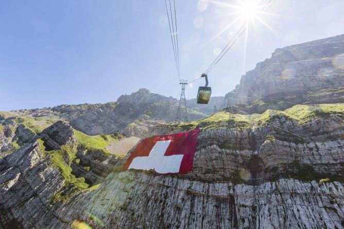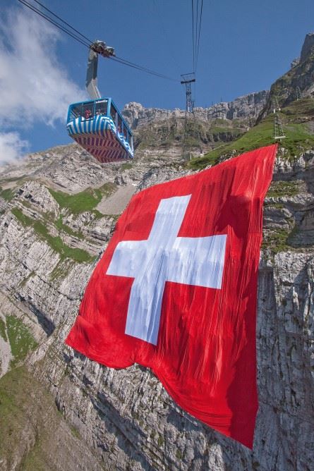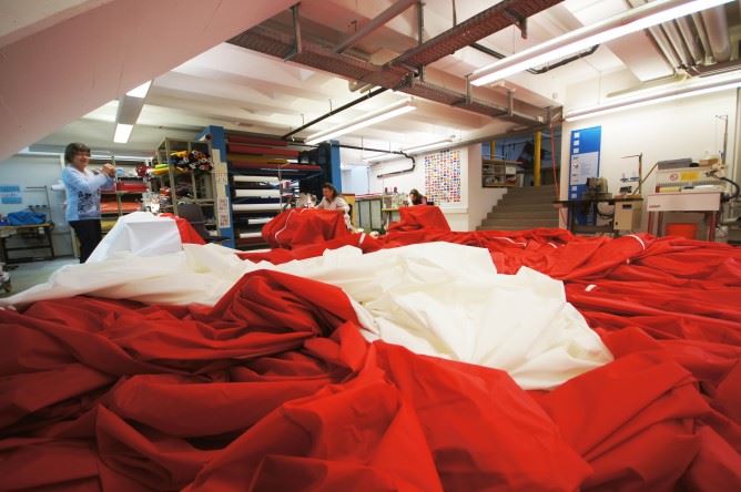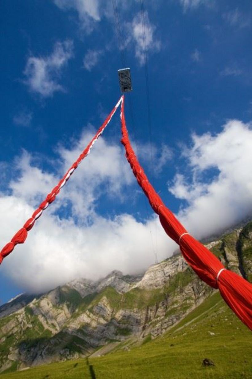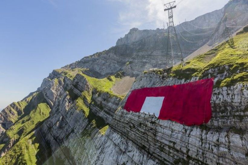 Die Schweizerfahne ist 6'400 m2 gross. In 600 Arbeitsstunden wurden 4'330 Laufmeter Stoff und 3'500 Laufmeter Gurten mit insgesamt rund 60 Kilometer Faden verarbeitet. Die Fahne kann bis zum 2. August am Säntis bestaunt werden. Dann wird sie wieder eingerollt und ins Tal transportiert. (htr/npa)